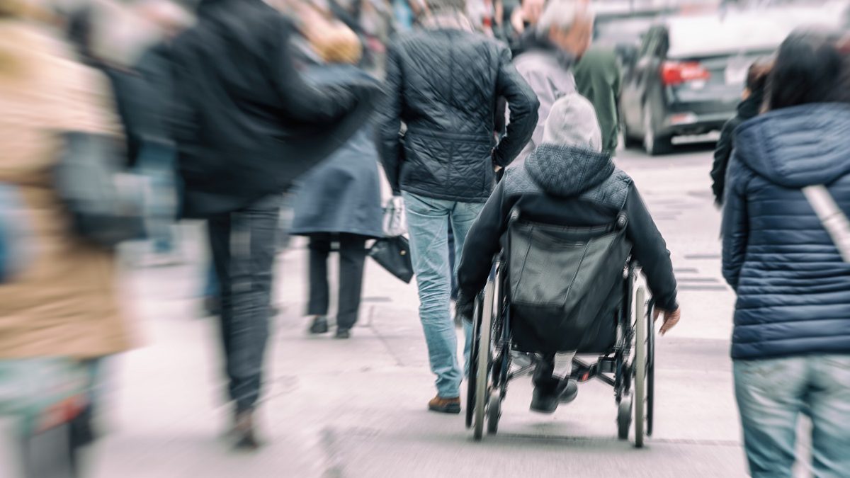 Disabled man sitting in a wheelchair on a busy street